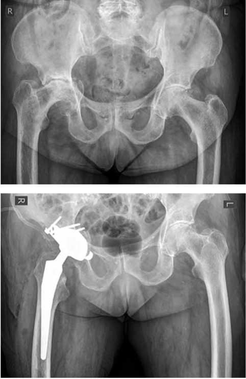 Рисунок 2. Рентгенограммы пациента Ф., 82 лет. а — правосторонний коксартроз 3 ст. (протрузионная форма), АНГБК; б — имплантирован эндопротез правого тазобедренного сустава с низкопрофильными пинами системой с двойной мобильностью